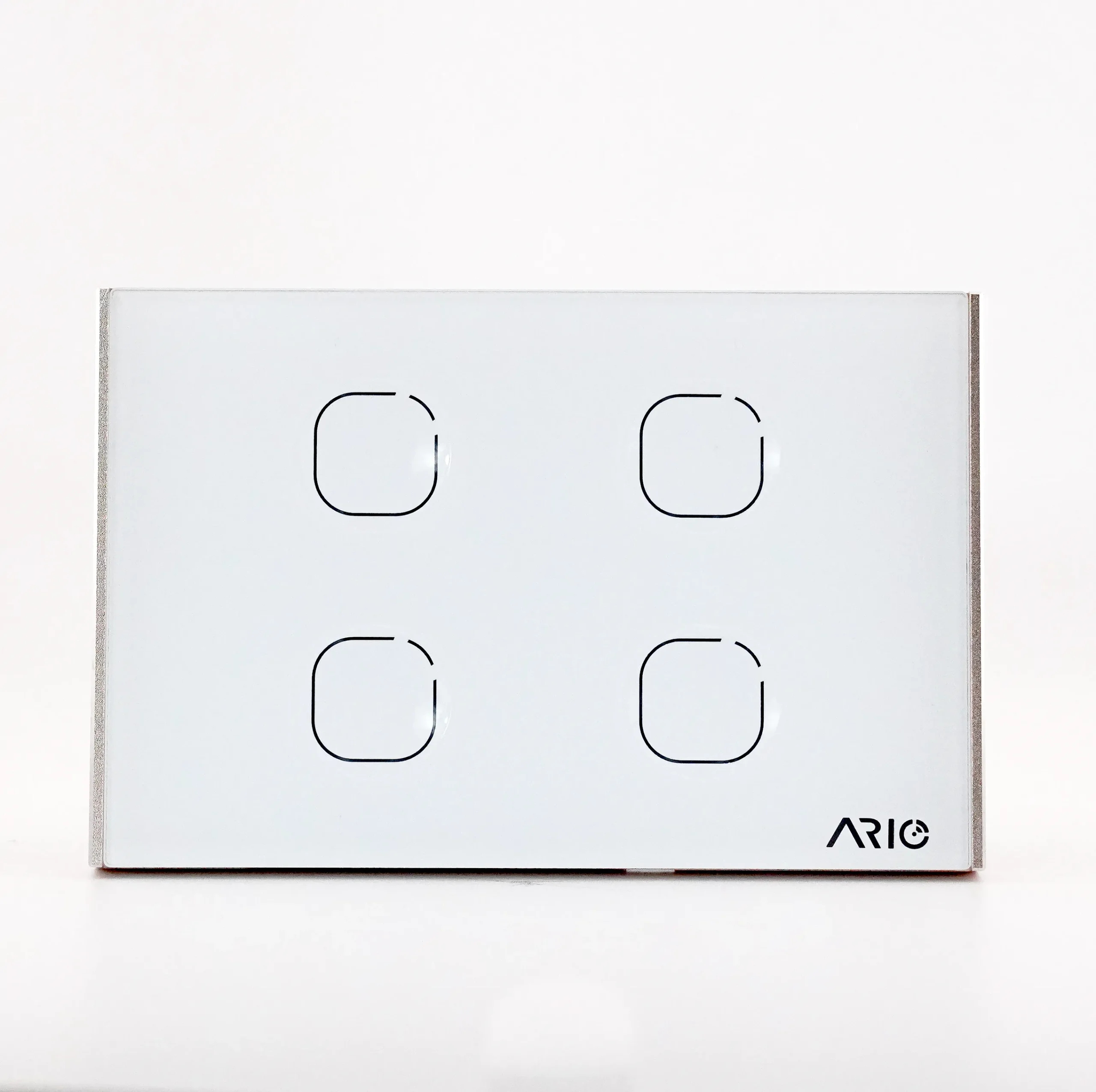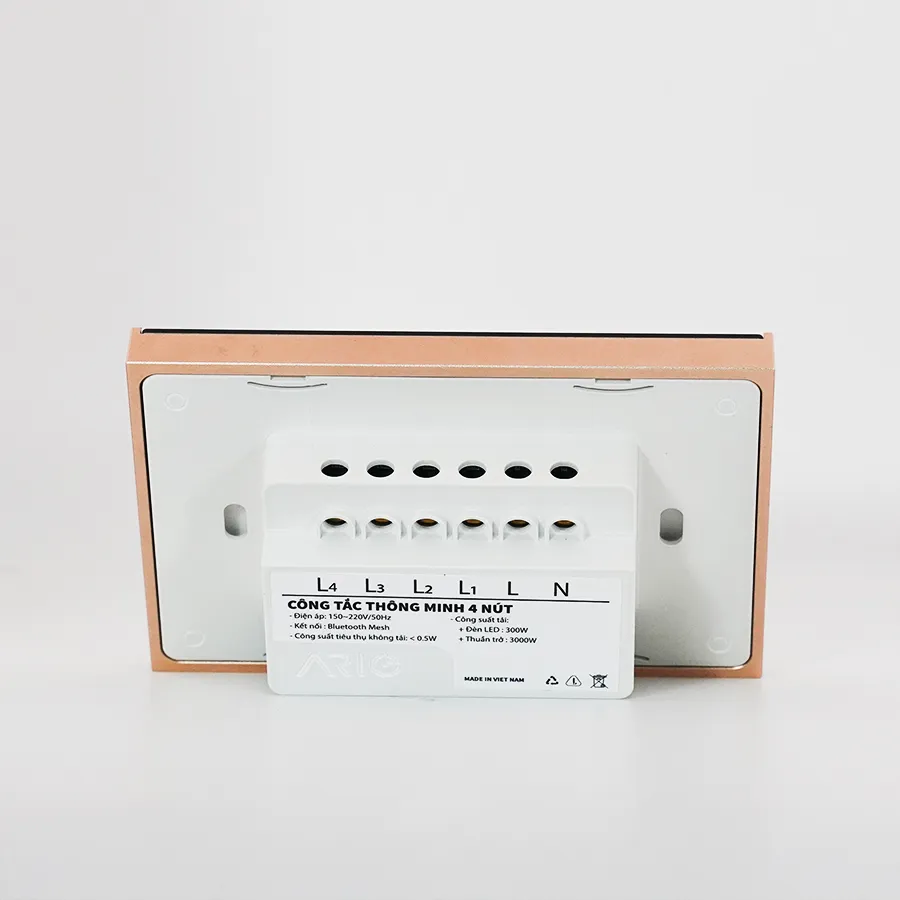 BLE 4 nút Ario sở hữu kiểu dáng hình chữ nhật gọn gàng, với mặt kính cường lực tráng gương chống xước, chống bám vân tay, dễ vệ sinh. Viền nhôm nguyên khối được gia công CNC sắc sảo, tạo hiệu ứng phản chiếu tinh tế khi lắp đặt trên tường.