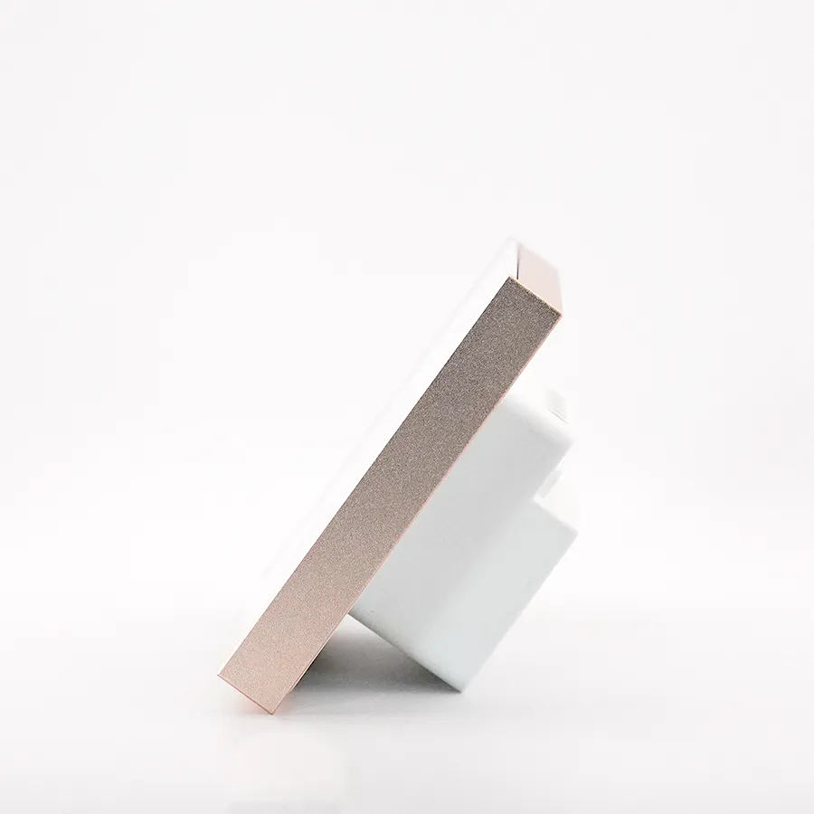 Công tắc cửa cuốn, cổng tự động cảm ứng thông minh BLE sở hữu mặt kính cường lực phẳng chống xước, chống va đập, kết hợp viền nhôm nguyên khối được xử lý CNC tinh xảo. Đèn LED trạng thái bao quanh nút cảm ứng tỏa sáng dịu nhẹ, dễ dàng nhận diện vào ban đêm.